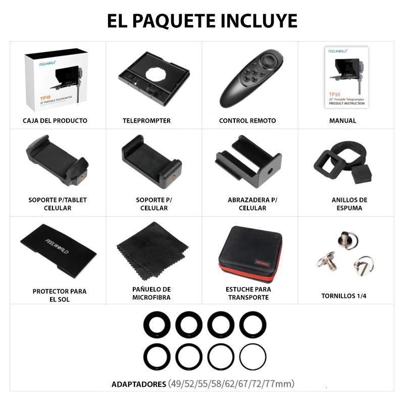 La TP10 viene con ocho anillos adaptadores de lentes estándar: 49/52/55/58/62/67/72/77 mm. Puede elegir uno de ellos para la lente de su cámara, lo que requiere conectar firmemente la cámara y el teleprompter.