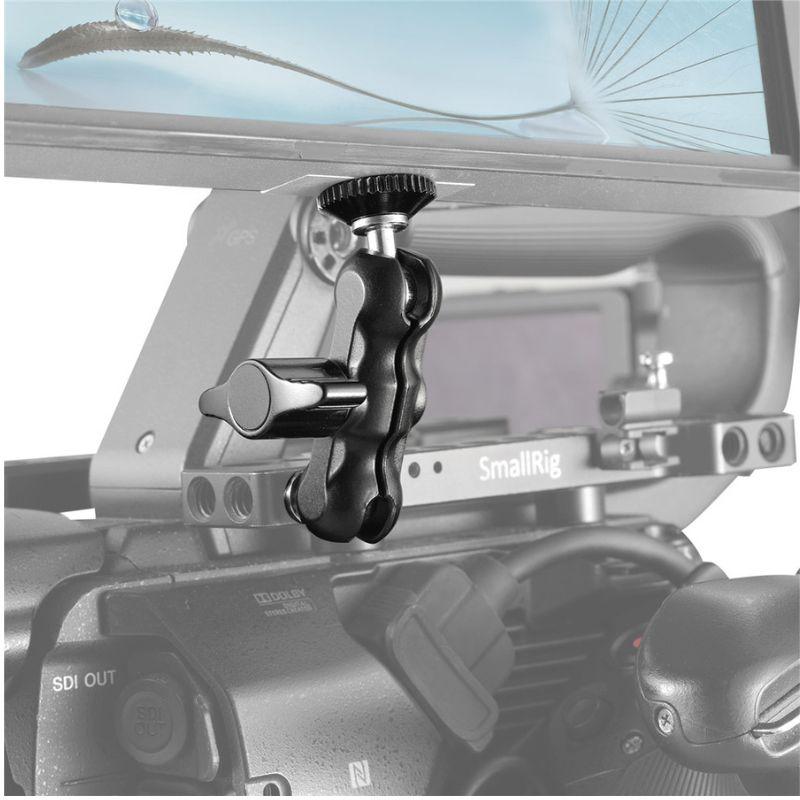 El brazo mágico universal SmallRig 2158 con rótula pequeña consta de dos brazos mágicos con una rótula de 9 mm de diámetro. Cada brazo mágico tiene tornillos de 1/4"-20 en ambos extremos. Permite acoplar una jaula para cámara, una placa superior y una empuñadura superior 1955/1984 en un extremo, y un monitor o una luz de vídeo en el otro.