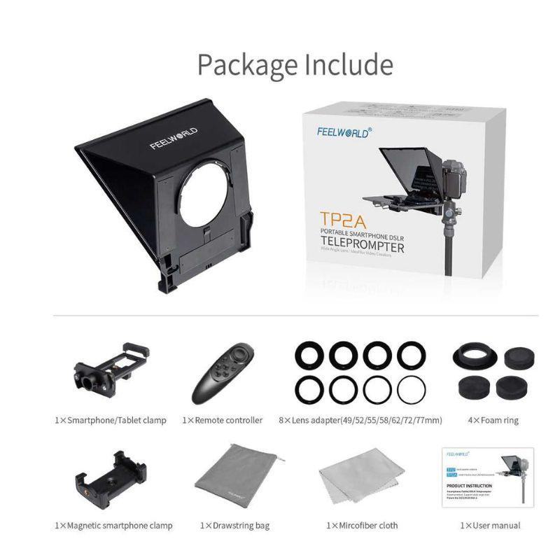 El TP2A es de tamaño compacto y pesa solo 300 gramos, lo que es fácil de colocar en una bolsa con cordón adjunta para proteger el teleprompter y al mismo tiempo permite una transición rápida. Además, el paño de microfibra adjunto puede mantener limpio el teleprompter en todo momento.