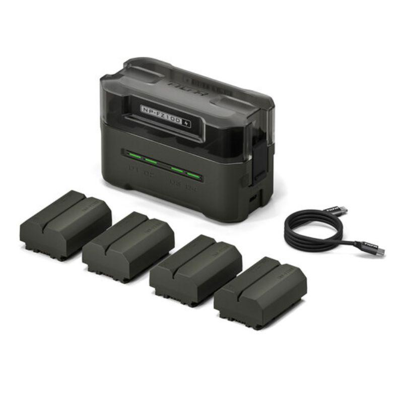 Este kit NP-FZ100 de Tilta viene con cuatro baterías NP-FZ100 recargables USB-C de Tilta, una estación de carga de energía y un cable USB-C. La estación de carga portátil requiere un adaptador de corriente disponible por separado con al menos 45 W de potencia de carga para lograr los tiempos de carga rápida más rápidos.